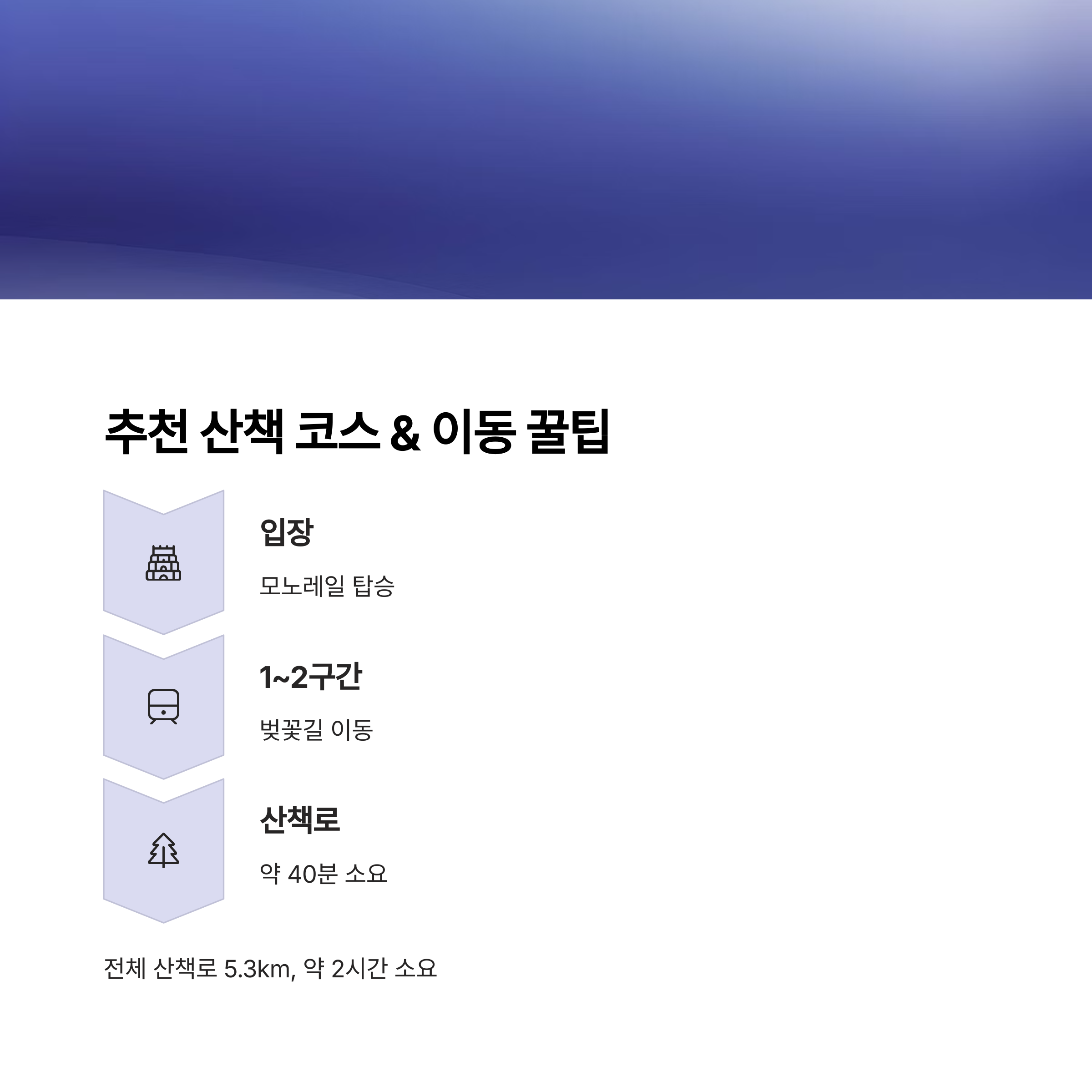 사진 명소: 벚꽃길, 수선화 언덕, 모노레일 전망대, 원시림 다리