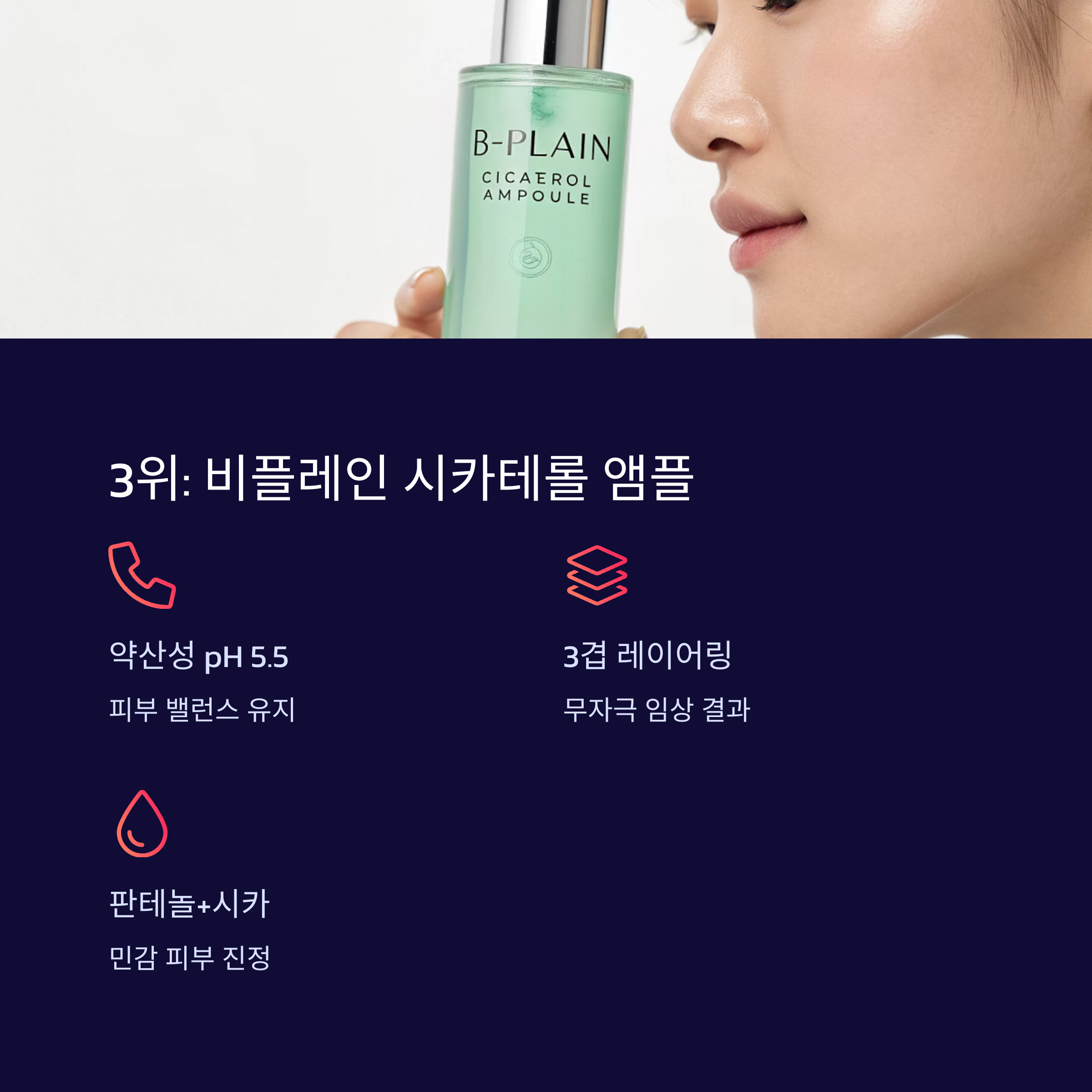 | 20대 대학생 | 여드름형 | "비플레인은 진짜 아무 자극 없어요. 피부에 쏙 흡수돼요" |