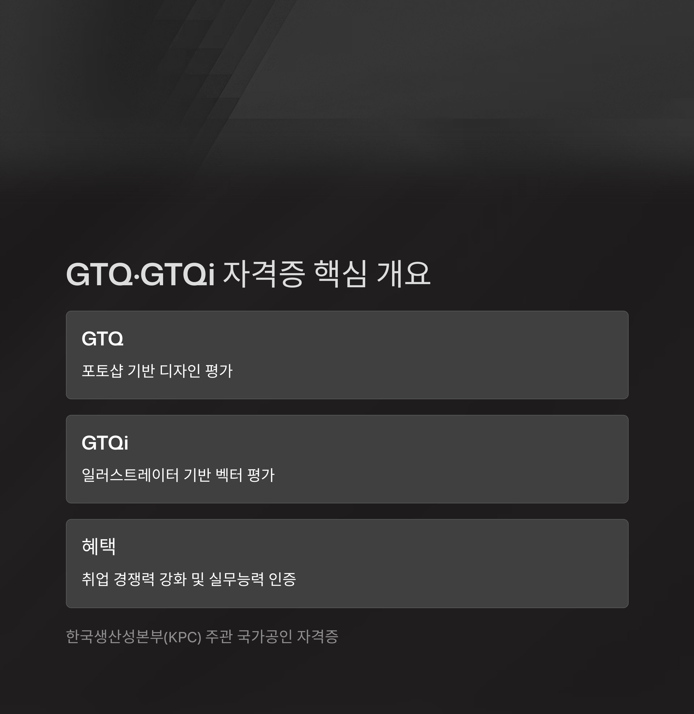 GTQ(포토샵)와 GTQi(일러스트레이터)는 디자인 실무능력을 공식적으로 증명할 수 있는 대표적인 국가공인 자격증입니다.
