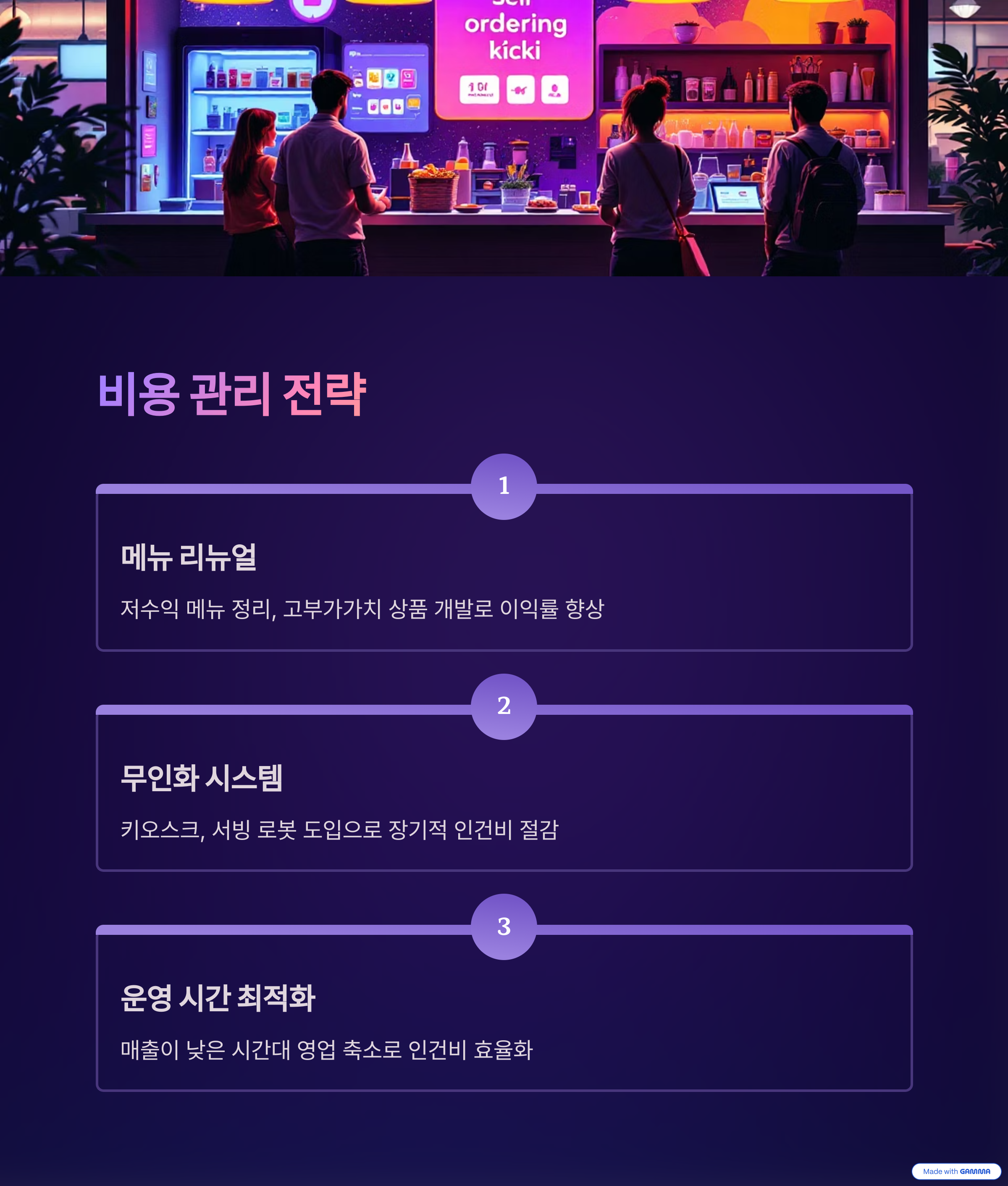 또한 무인화 기술 도입과 메뉴 단순화를 통해 효율을 높일 수 있습니다.
