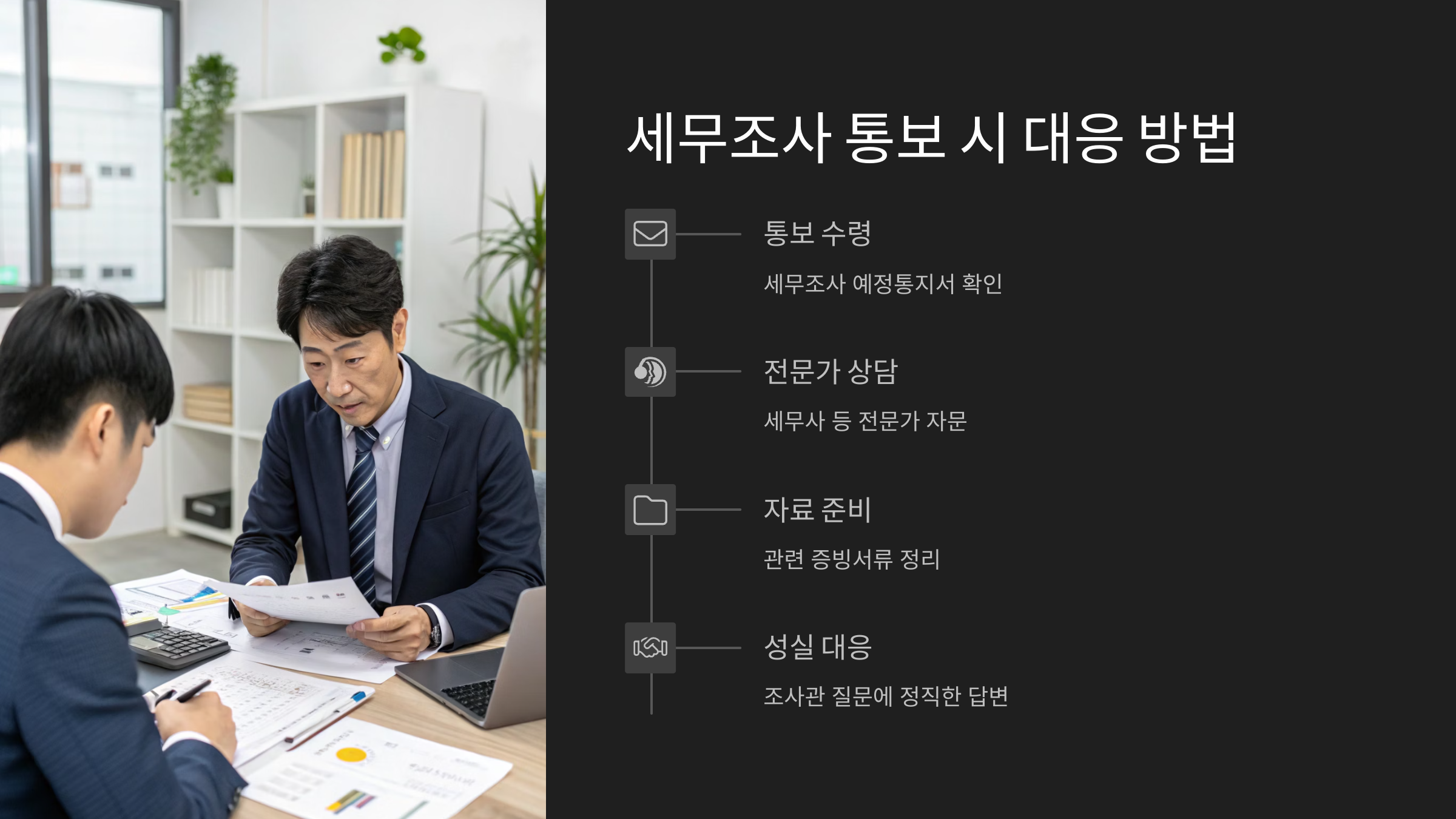 세무조사는 초기 대응이 절반을 좌우합니다. 신속하고 침착하게 대처해야 합니다.