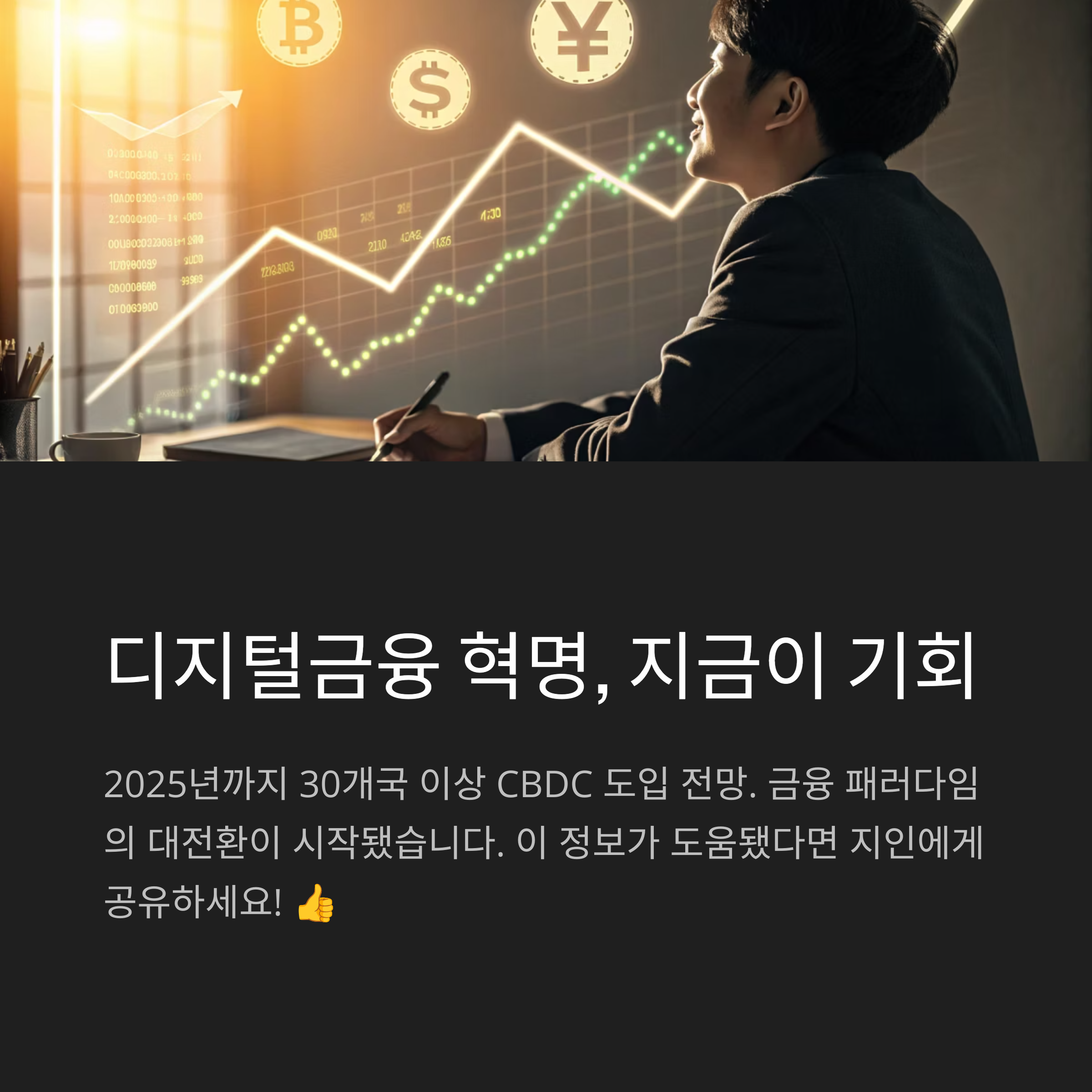 CBDC는 단순한 디지털 화폐가 아니라, 금융의 판을 바꾸는 혁신입니다. 지금은 그 변화의 시작점이며, 초기 진입자에게 기회가 주어지는 시기입니다. 투자자로서 지금 포지션을 잡는 것은 미래의 금융 인프라에 참여하는 것이며, “100% 적극 매수”라는 표현이 결코 과장이 아닐 수 있습니다.