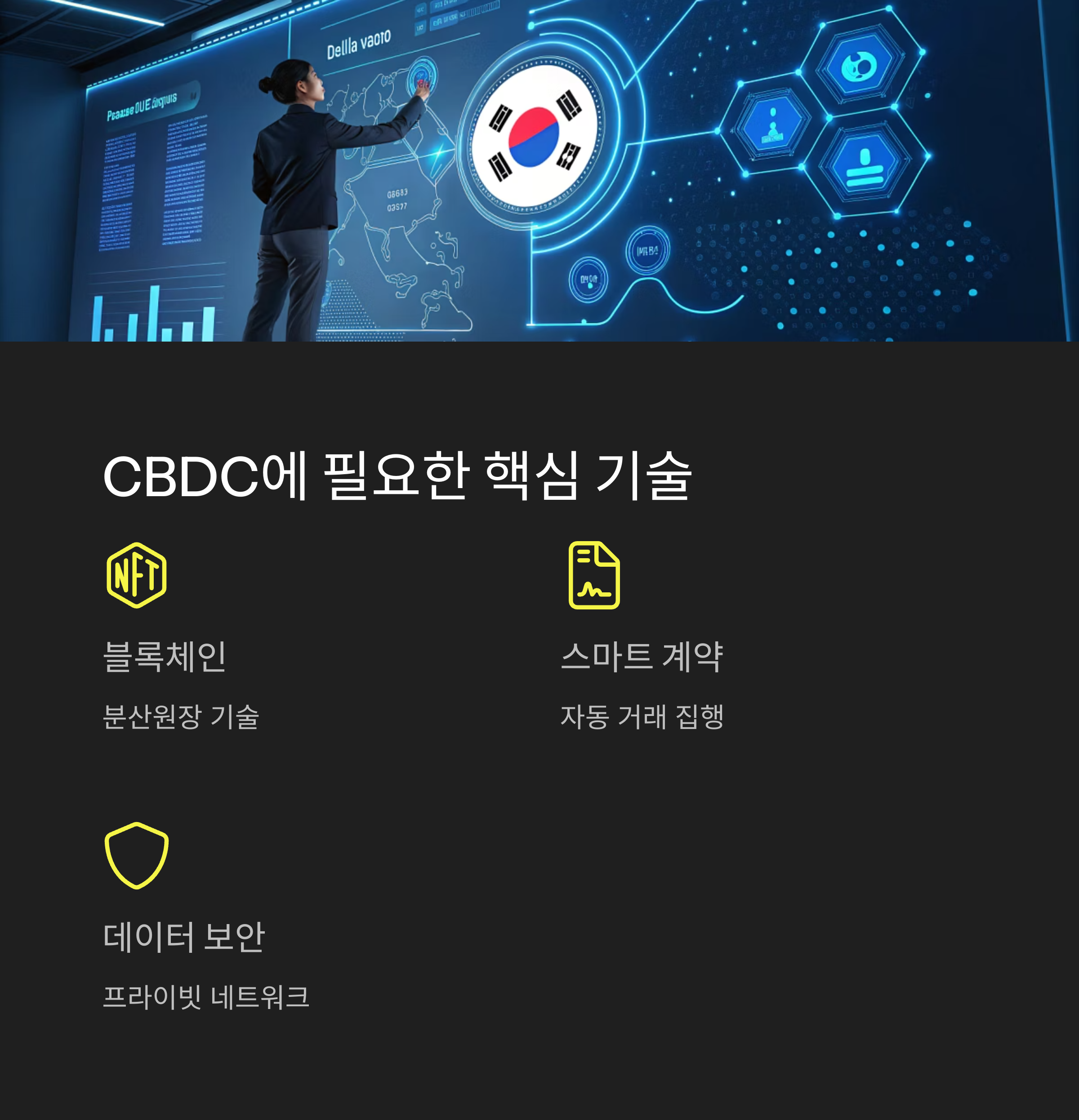 CBDC는 중앙은행이 직접 발행하는 디지털 화폐로, 암호화폐가 아닌 국가 보증의 디지털 법정화폐입니다. 블록체인 기반으로 투명한 거래와 스마트 계약, 실시간 결제 등 다양한 기술 확장성을 갖추고 있습니다.