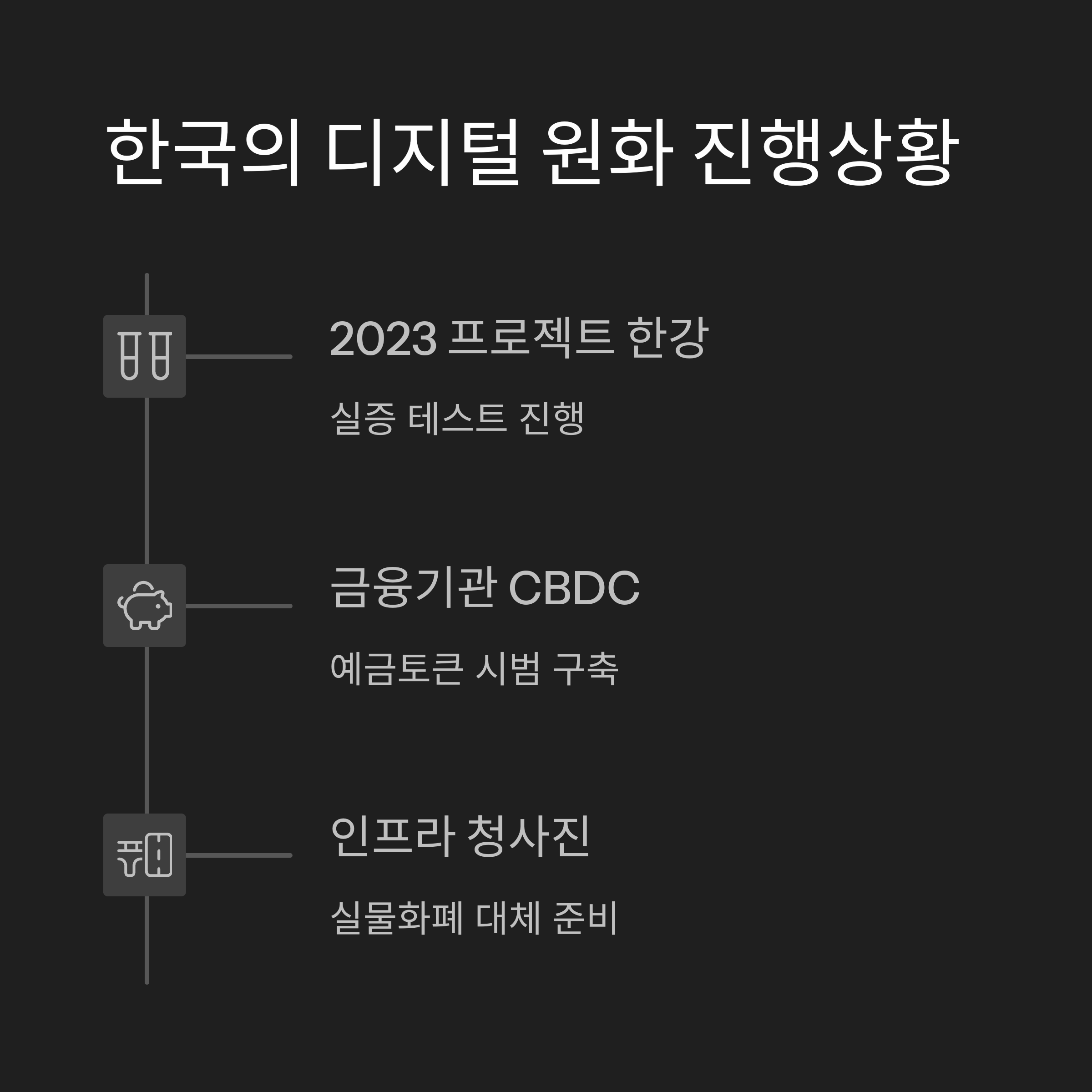 | 🇰🇷 한국 | 디지털 원화 테스트 완료 | LG CNS, 그라운드X 등 참여 |